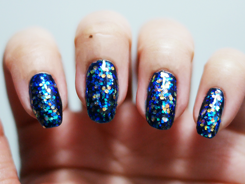 This is Revlon's Heavenly over a black nail polish base. Heavenly consists of holo-gold hex glitter and holo-blue square glitter in a clear base. The glitter aren't opaque so they do look better against darker colours.