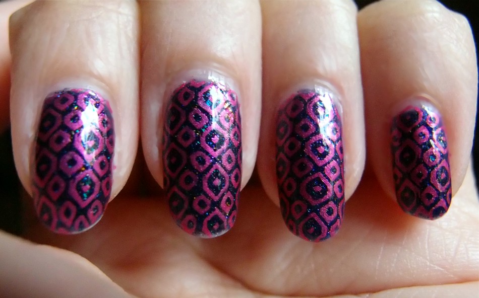 So to paint over the vinyls, I used Lacquistry's Soulstice, which is microflakie glitter in a blue jelly base, and Lacquistry's Rediculous, which is a microflakie glitter in a red jelly base.